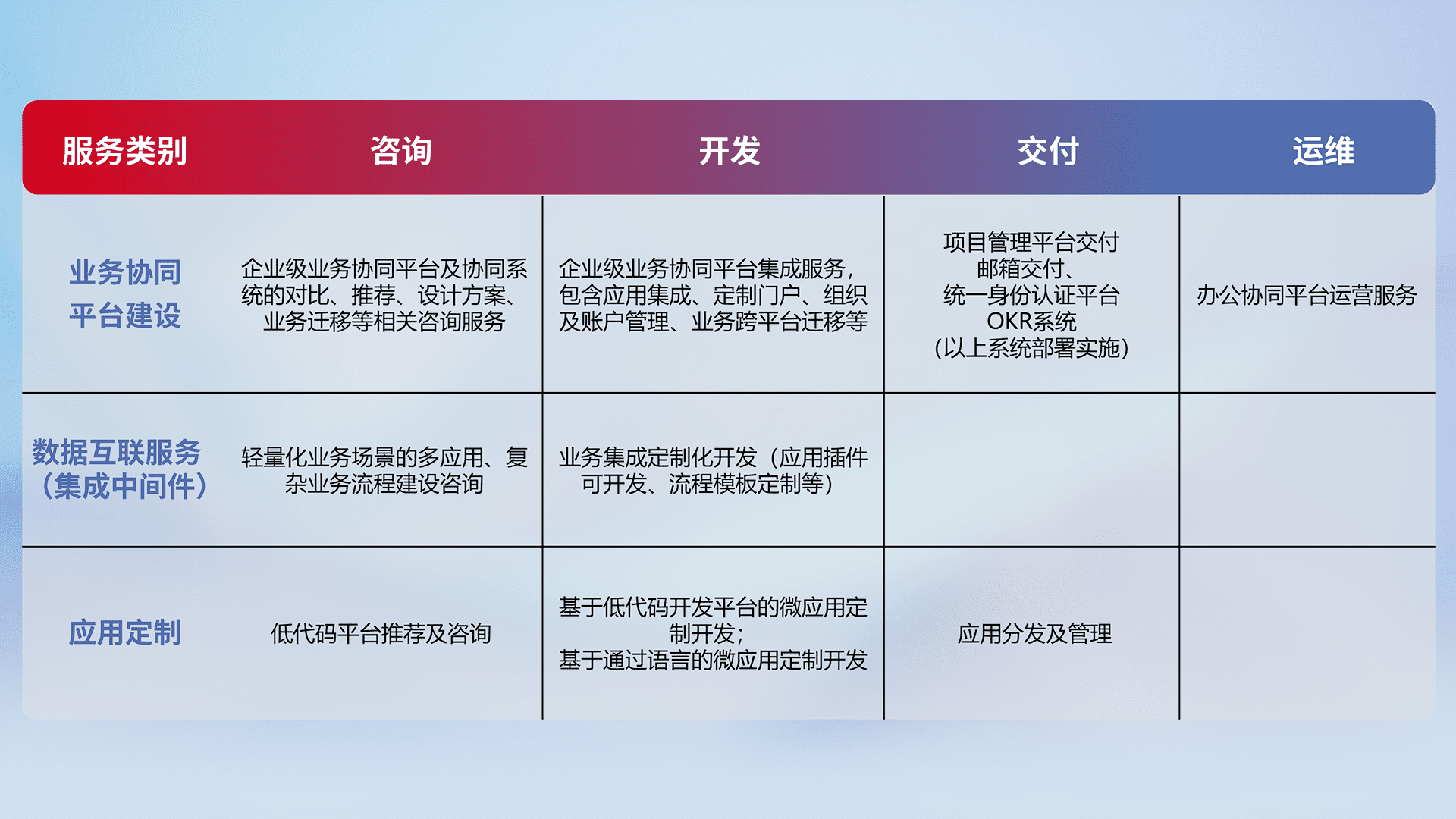 针对钉钉、、、企微、、IDaas等平台级产品提供产品的规划、、、、方案、、交付、、、、定制化开发等服务,,,实现如统一协同办公、、智能客户服务、、、、混合会议管理、、智能数据查询、、、、等业务场景,,,,实现数字化转型。。。